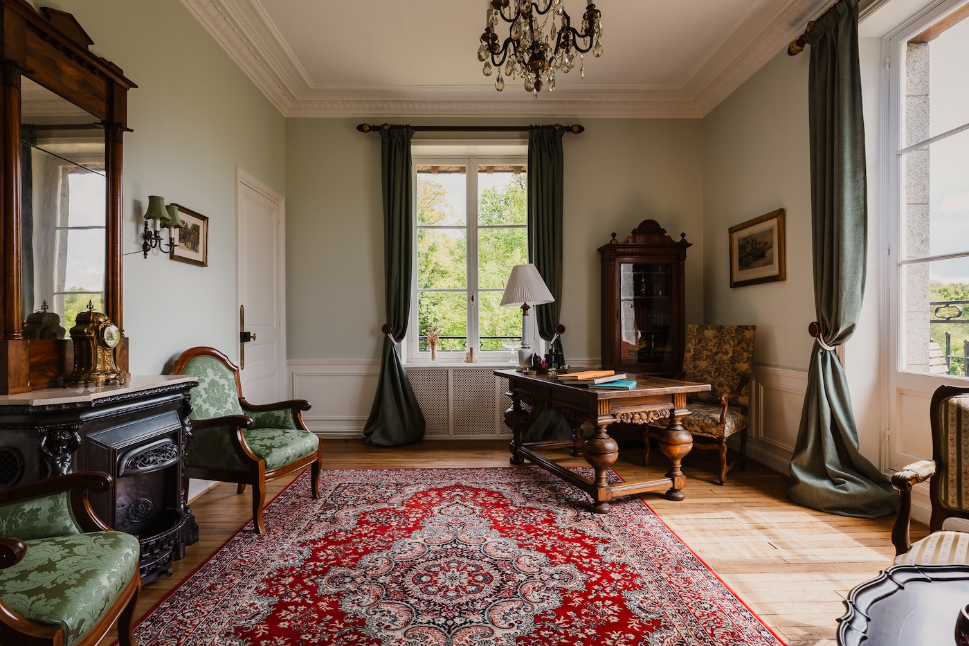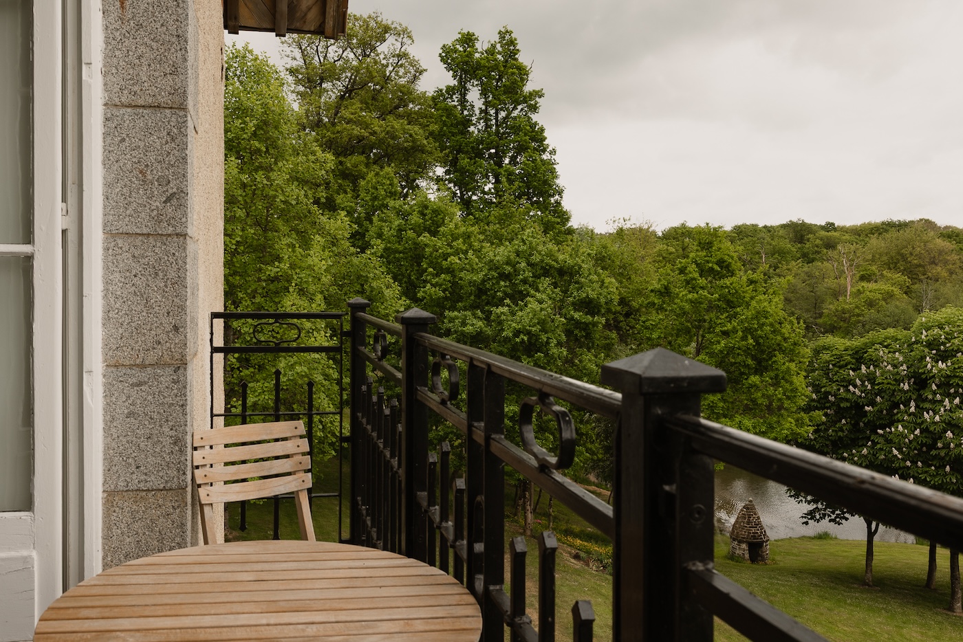 På balkonen, der vender mod syd, kan du sidde og nyde et glas vin eller morgenkaffen samtidig med du nyder udsigten ud over parken og skoven omkring slottet.
